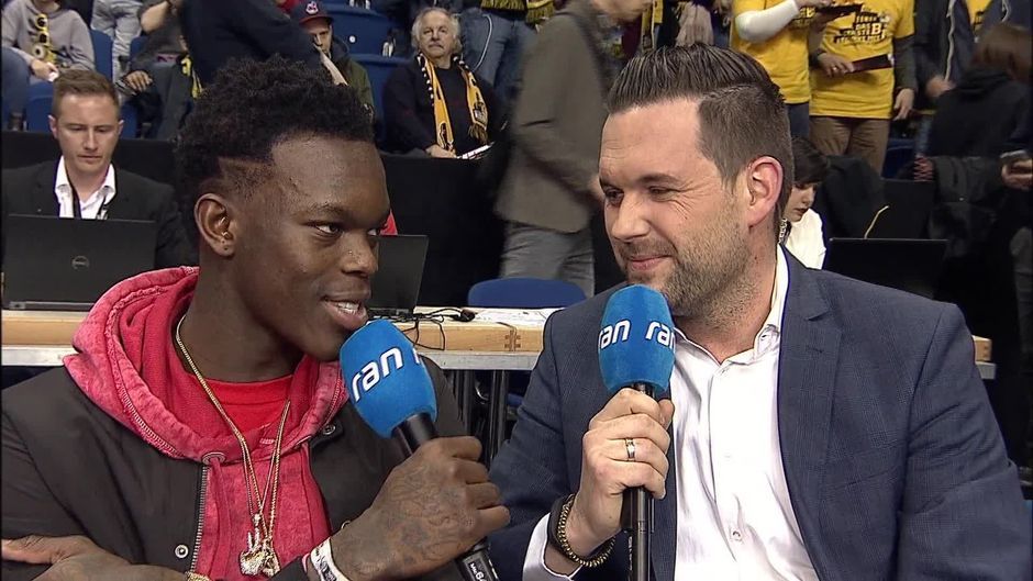 Exklusiv: Der deutsche NBA-Star Dennis Schröder beim Interview mit ran-Moderator Matthias Killing. Der 23-jährige Point Guard der Atlanta Hawks besucht das Top-Four-Turnier in Berlin und steht uns Rede und Antwort.