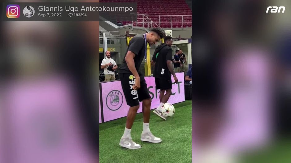 Basketball-Superstar Giannis Antetokounmpo besucht das erste Champions-League-Spiel seines Lebens. Nach dem Sieg vom FC Bayern bei Inter Mailand zeigt Giannis mit Schuhgröße 49 seine Technik.