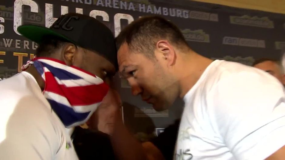 Vor dem "Kampf der Giganten" am Samstag (ab 22:50 Uhr live in SAT.1 und auf ran.de) ist es erneut zum Eklat gekommen. Chisora wird während des Wiegens mit einer Flasche gehauen und verfolgt seinen Angreifer dann durch das Hotel.