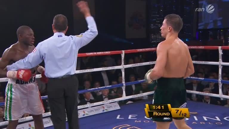 Das war's dann für Adama. Gennady Golovkin deckt den Ghanaer derart massiv mit Schlägen ein, dass der Ringrichter auf technischen K.O. entscheidet.