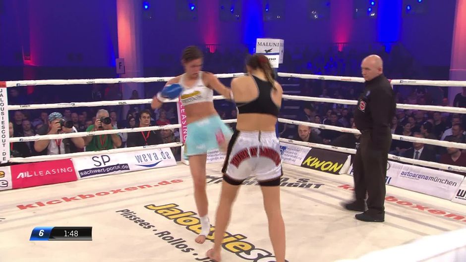 Die achtmalige Weltmeisterin Marie Lang trifft auf die Marokkanerin Rachida Bouhout. Sehen Sie hier Runde 6 aus dem Postpalast München.