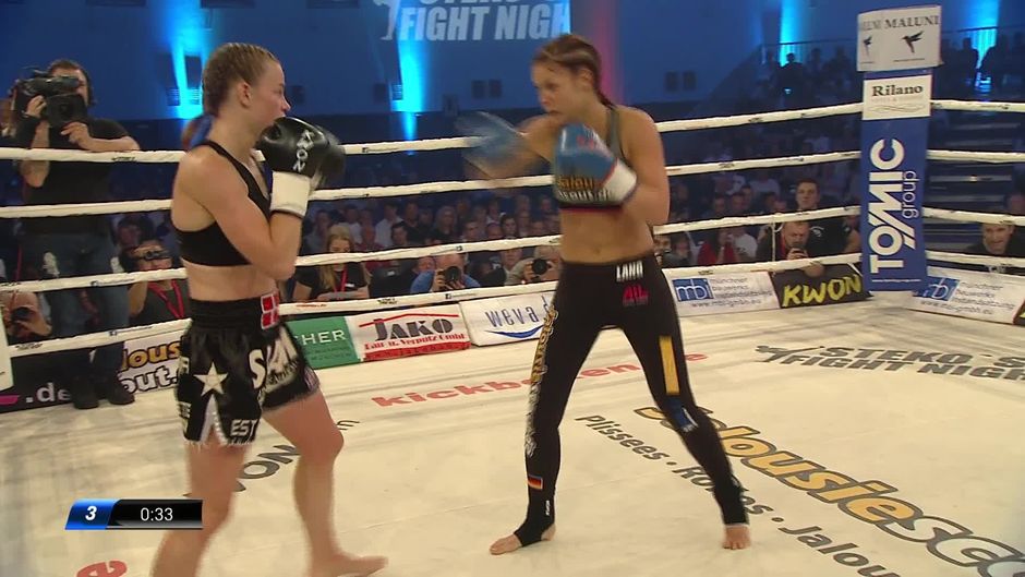 Die dritte Runde des WKU-WM-Kampfes im Kickboxen zwischen Marie Lang und Pernille Schjonning.