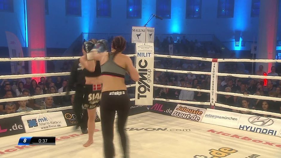 Die achte Runde des WKU-WM-Kampfes im Kickboxen zwischen Marie Lang und Pernille Schjonning.