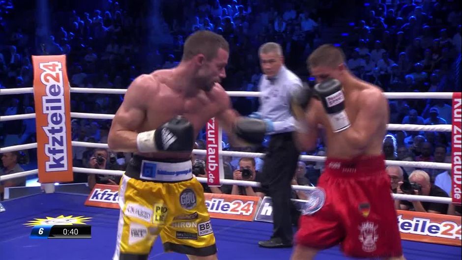 Nachwuchs-Hoffnung Tyron Zeuge kämpft in Berlin um die WBA-Weltmeisterschaft im Mittelgewicht gegen Giovanni de Carolis. Runde 6 in voller Länge.