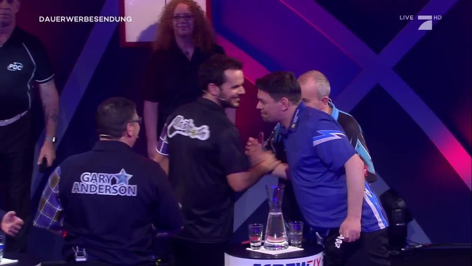 Im ersten Spiel stehen sich TIm Mälzer mit Profi Phil Taylor und Steffen Henssler mit Profi Gary Anderson gegenüber.