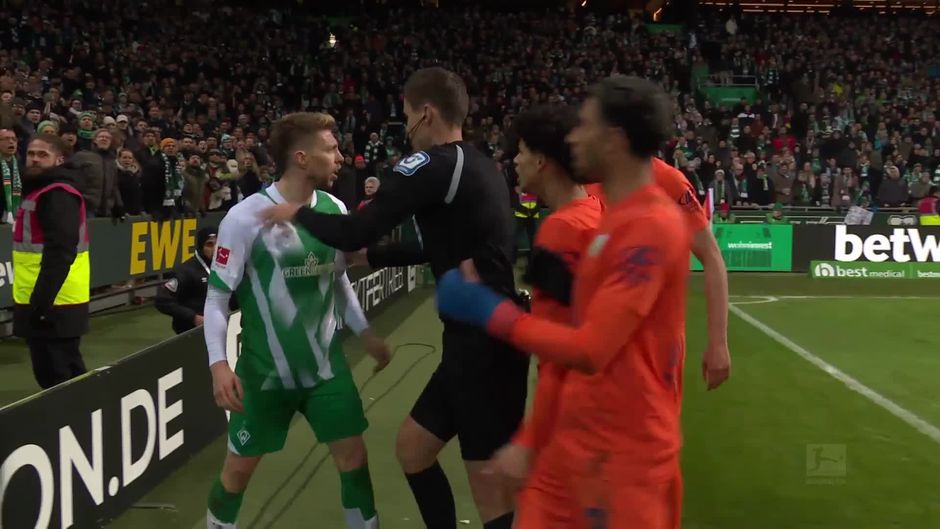 In der Schlussphase der Partie zwischen Werder Bremen und dem VfL Wolfsburg kommt es zu einem hitzigen Gerangel.