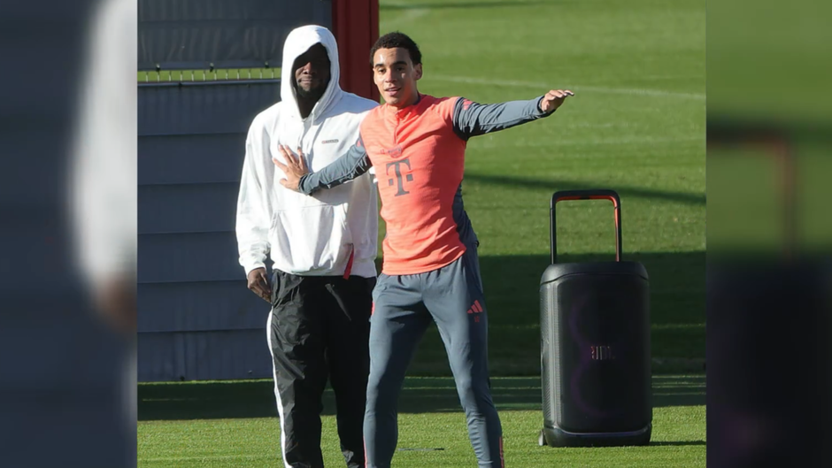 Jamal Musiala steht endlich wieder auf dem Platz an der Säbener Straße und trainiert zum ersten Mal mit dem Ball. Dabei bekommt der Bayern-Star Unterstützung von einem Teamkollegen.