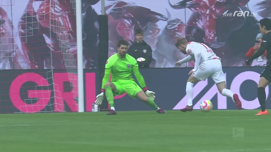 Timo Werner schießt das 1:0 gegen Eintracht Frankfurt nach Vorarbeit von Emil Forsberg. Dieser ist überrascht von Werners Abschluss und wie der Ball im Tor landet. Auch das 2:0 ist eine Co-Produktion der beiden.