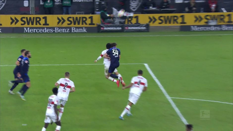 Schrecksekunde für Stuttgart-Coach Michael Wimmer: VfB-Kapitän Wataru Endo bleibt kurz vor Ende der Partie benommen liegen. In einem Luftzweikampf mit Herthas Ivan Sunjic knallen beide Köpfe aneinander.