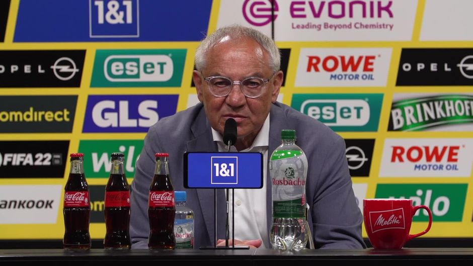 Felix Magath, Trainer von Hertha BSC, stellt sich nach der Niederlage am letzten Spieltag gegen Borussia Dortmund den Fragen der Journalisten und spricht, unter anderem, gegen ein mögliches Relegations-Duell gegen den Hamburger SV.