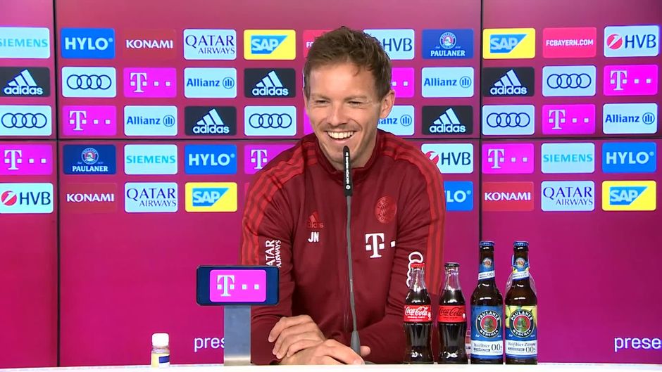 Was ist das für ein Zaubertrank vor Julian Nagelsmann? Ein Bio Kukuma-Maracuja-Mango Shot, erklärt der Bayern-Coach. Vielleicht sogar das Erfolgsgeheimnis für sein stetig hohes Energielevel.