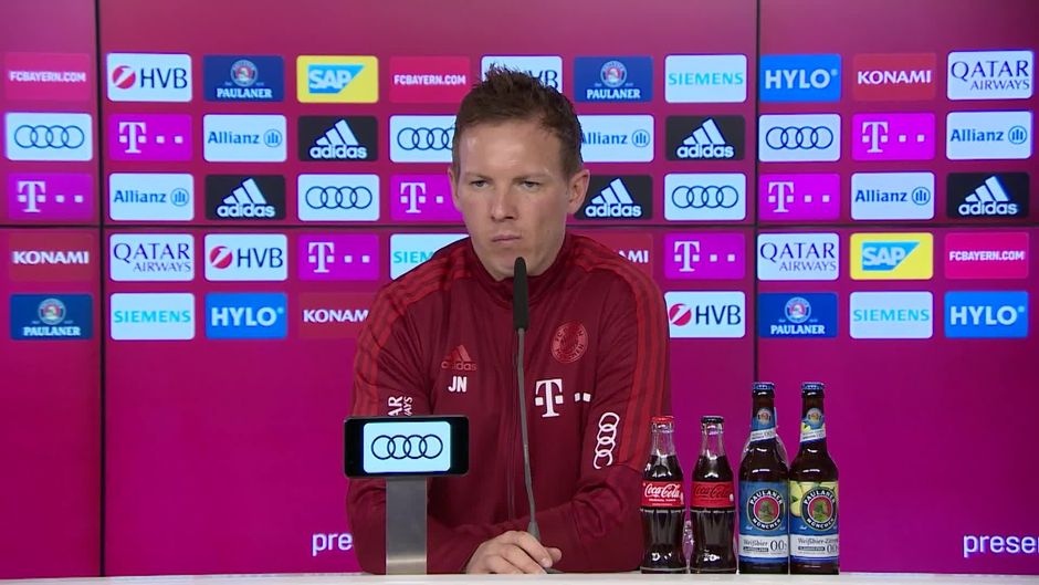 Zu den beiden Verletzten Alphonso Davies und Leon Goretzka kann Julian Nagelsmann wenig konkrete Aussagen machen. Für beide stehe nicht wirklich ein Zeitplan für eine baldige Rückkehr fest.