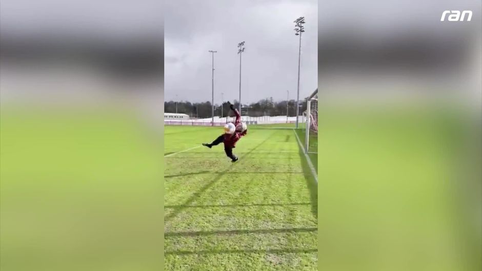 FCB-Trainer Julian Nagelsmann erlaubt sich einen Spaß während des Trainings und stellt seine Torwart-Fähigkeiten unter Beweis.