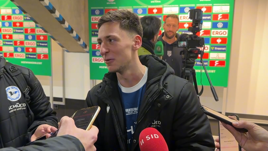 Marius Wörl erzielt im Viertelfinale zwischen Arminia Bielefeld und Werder Bremen das 1:0 und leitet mit dem Treffer die Pokalsensation der Arminia ein.