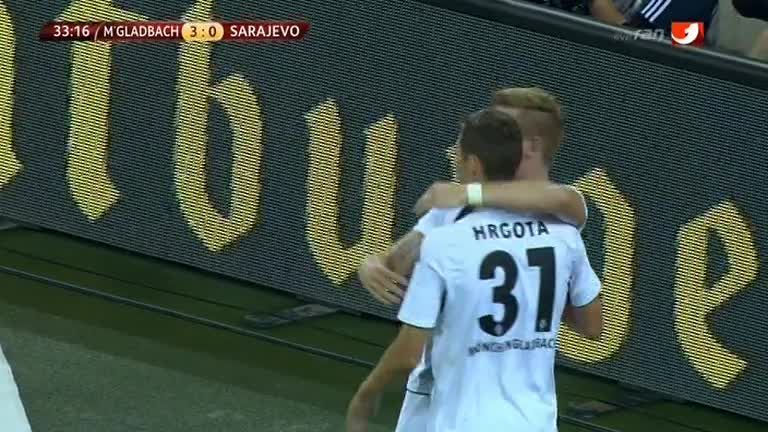 Europa-League-Qualifikation: Borussia Mönchengladbach gegen FK Sarajevo. Johnson dringt in den Strafraum ein und legt dann auf Hrgota rüber, der nur noch den Fuß hinhalten muss. 3:0!