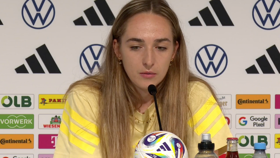Vor dem Halbfinale der Frauen-EM stellt sich Sophia Kleinherne den Fragen bei einer Pressekonferenz. Dabei spricht sie über ihre Rolle bei den DFB-Frauen.