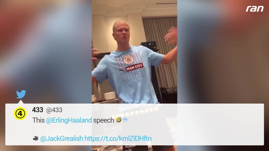 Erling Haaland ist kein Mann der vielen Worte! Für seiner Antrittsrede bei Manchester City braucht der Norweger nicht lange und wird von den neuen Mitspielern gefeiert.