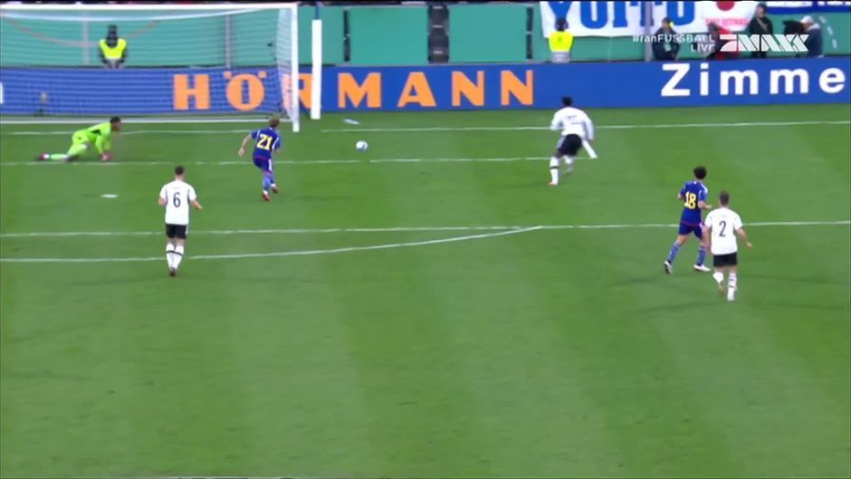 Faride Alidou hat in der 9. Minute die Riesenchance zur Führung für die U21. Japans Torhüter ist in letzter Sekunde zur Stelle.