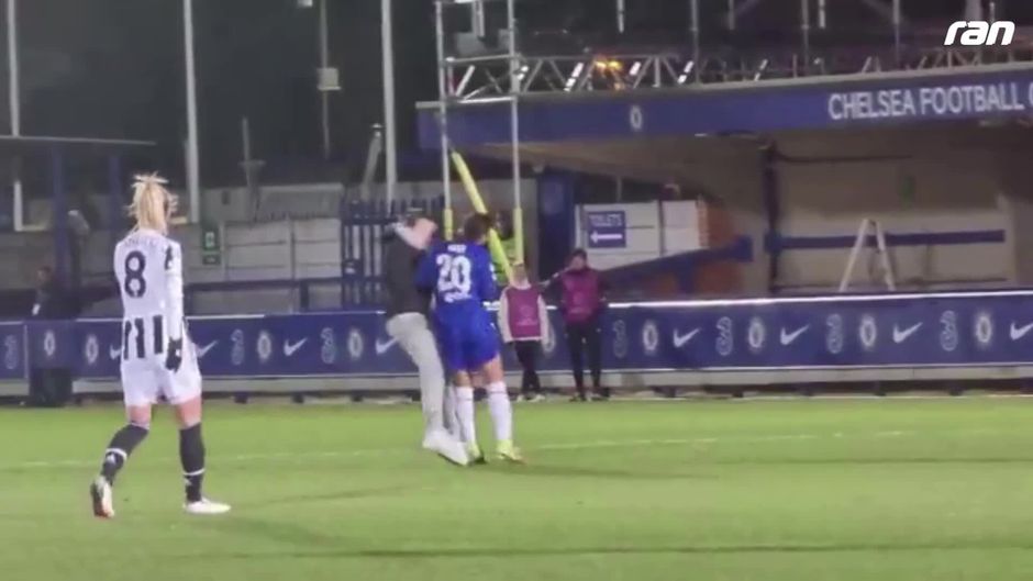 Ein Flitzer stört das Champions League Spiel der Frauen zwischen dem FC Chelsea und Juventus Turin und wird von der Spielerin Sam Kerr zu Boden gebracht.