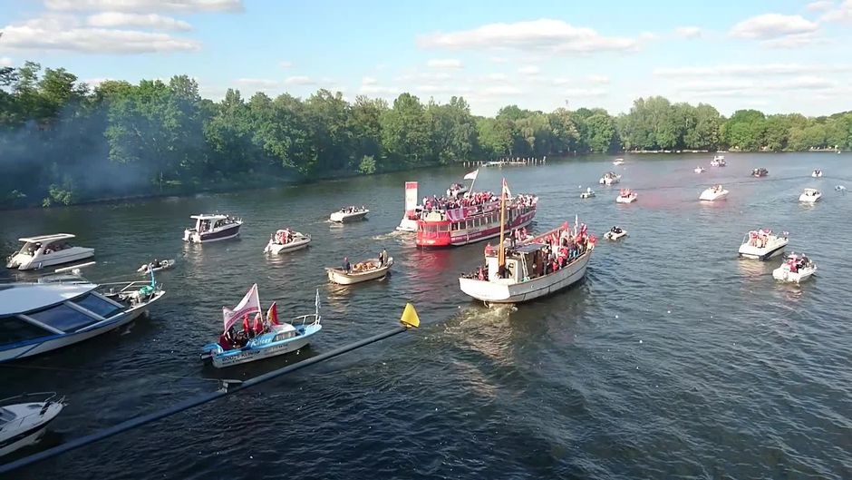 Dank einem 0:0 im Relegations-Rückspiel gegen den VfB Stuttgart steigt Union Berlin in die erste Liga auf. Das Team zelebriert den Aufstieg mit einer eigenen Armada auf der Spree. Die Fans lassen es knallen.