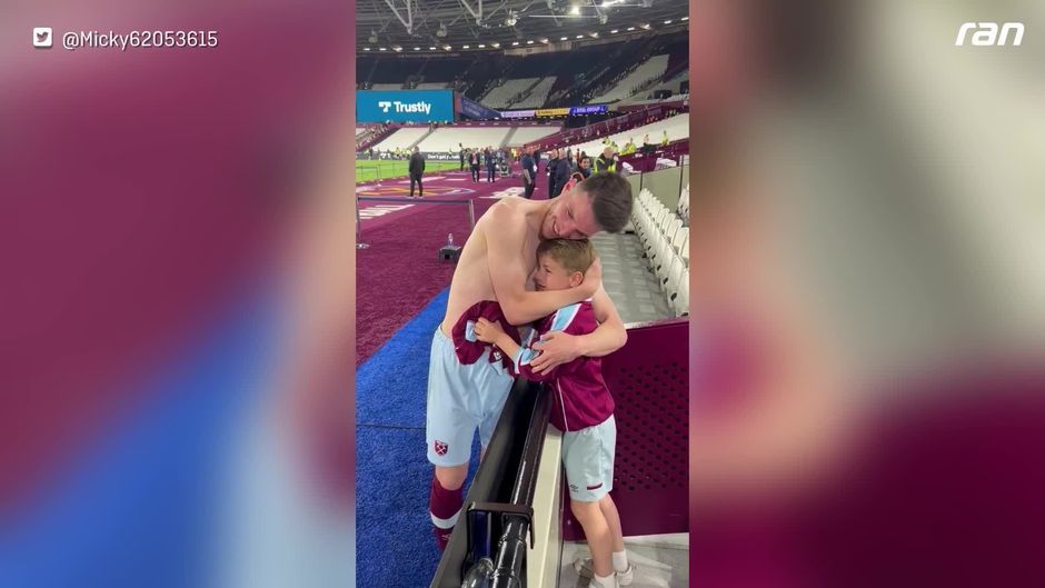 Nach dem Sieg von West Ham gegen Manchester United überrascht Mittelfeldstar Declan Rice einen in Tränen aufgelösten Jungen auf der Tribüne.