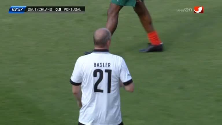 Die WM-Generalprobe: das ran Jahrhundertspiel Deutschland - Portugal. Mario Basler haut aus 20 Meter drauf und erzielt fast die deutsche Führung.