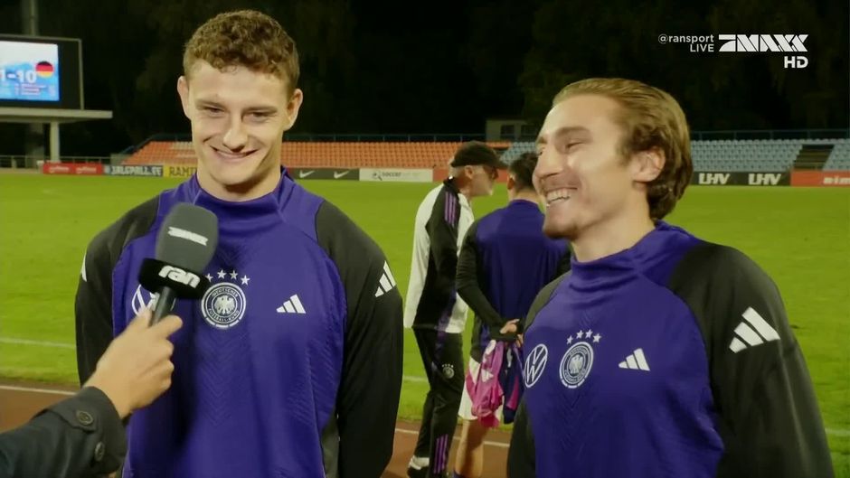Rocco Reitz und Eric Martel zeigen sich nach dem 10:1-Sieg gegen Estland gut gelaunt.