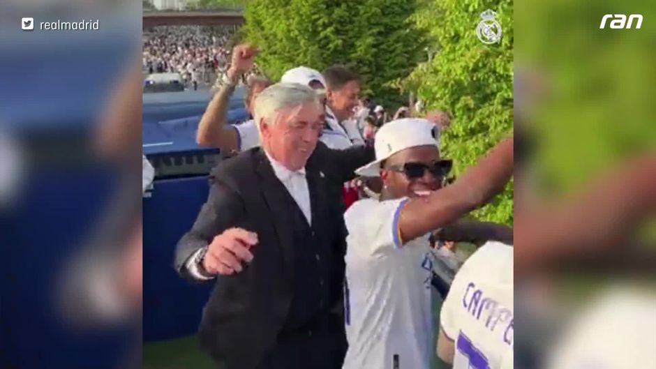 Real Madrid ist zum 35. Mal spanischer Meister. Das feiert die Mannschaft in einem Streifzug durch die Stadt. Dabei ist auch Trainer Carlo Ancelotti in Partystimmung und packt seine Tanzskills aus.