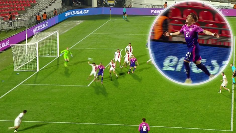 Beim Spiel der U21-Nationalmannschaft gegen Georgien trifft Bayern-Star Lennart Karl nach Vorarbeit von Said El Mala.