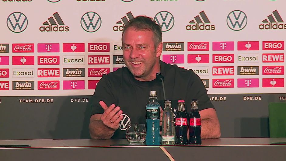 Während der Pressekonferenz der Nationalmannschaft wird Trainer Hansi Flick von seinem Mittelfeldstrategen Joshua Kimmich angerufen.