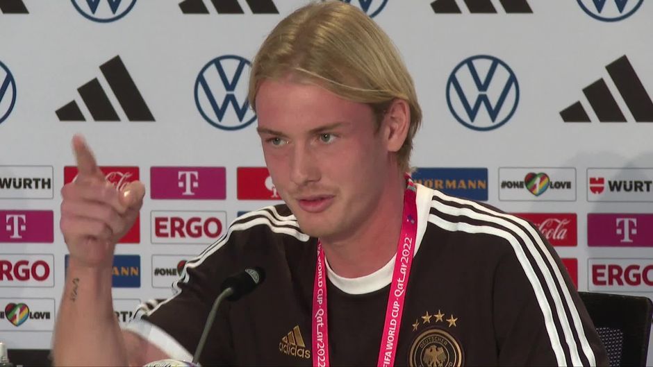 Hoffentlich kein schlechtes Omen! Julian Brandt sucht bei der Pressekonferenz händeringend nach dem Wort, was die Spieler jetzt übernehmen sollen.