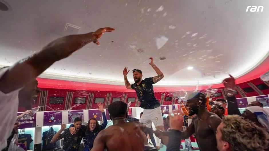 Frankreich stehen im Endspiel bei der WM in Katar. Die französischen Spieler feiern den Finaleinzug ausgelassen in der Kabine und bei der Ankunft im Hotel.