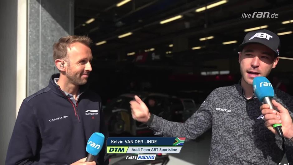 Ziemlich beste Freunde: DTM-Topfavorit Kelvin van der Linde scherzt im Interview mit ran-Experte Rene Rast.