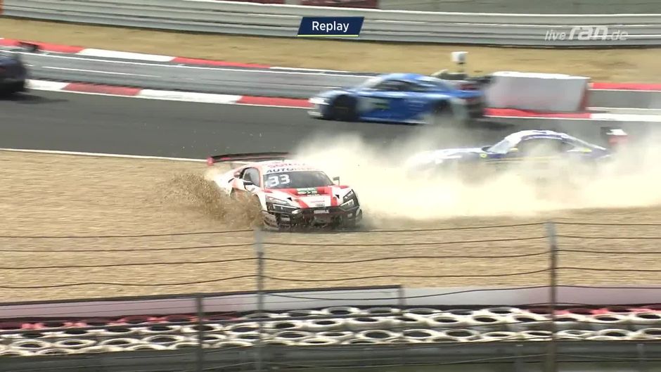 Bitter! Rene Rast, der gerade erst richtig in die Saison gekommen ist, muss raus. David Schumacher schiebt den Dominator ins Kiesbett und aus dem Rennen.
