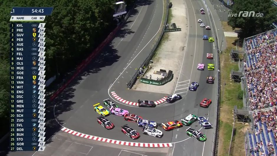Es war zu erwarten! Gleich in der ersten Kurve kommt es zur ersten Karambolage. Marco Wittmann, David Schumacher und viele andere Fahrer müssen das Rennen beenden.