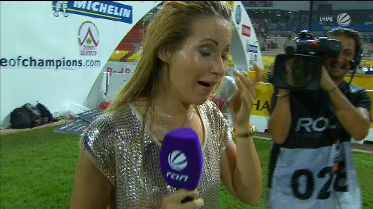Das Race of Champions 2012, Nations Cup: Nach der Siegerehrung bekommt ran-Moderatorin Andrea Kaiser eine Sektdusche aller höchster Güte von Michael Schumacher und Sebastian Vettel.