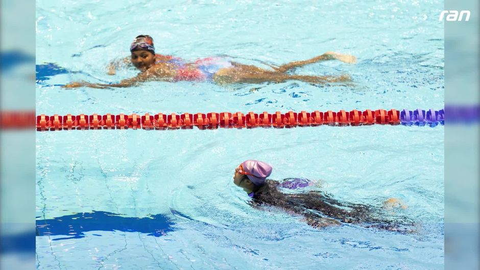 Das ist genau der Spirit der Special Olympics in Berlin. Eine Schwimmerin, die bereits im Ziel ist, begleitet eine Kontrahentin bis zum Ende.