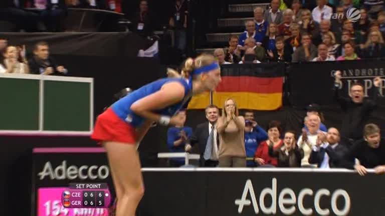 Angelique Kerber verliert den ersten Satz in ihrem Einzel gegen Petra Kvitova im Fed-Cup-Finale zwischen Tschechien und Deutschland nach einem dramatischen Tie-Break mit vielen starken Punktgewinnen für beide Spielerinnen mit 6:7.